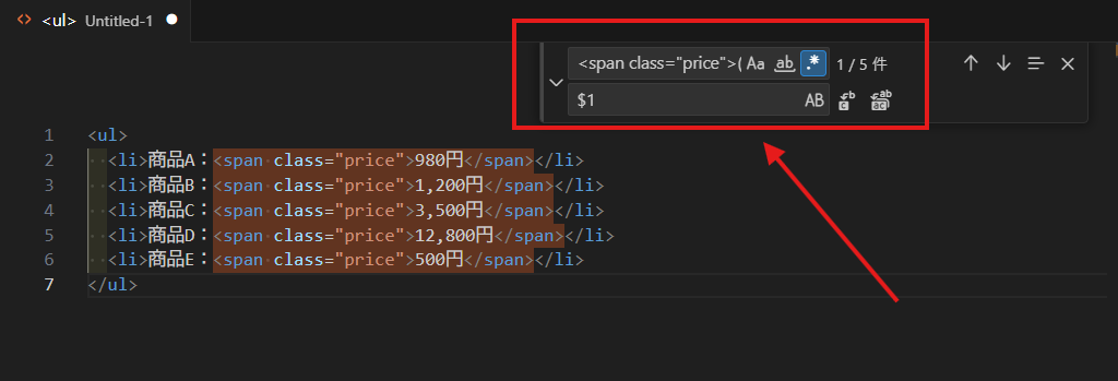 <span class="price">(.*?)</span>▼ 置換(Replace)