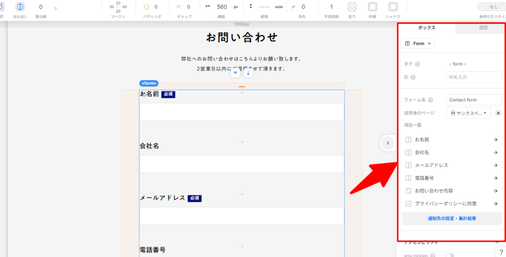 フォームを選択し、右側の「設定」パネルを開きます。