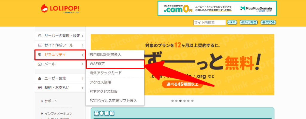 ロリポップサーバーには、WAF(ウェブアプリケーションファイアウォール)というセキュリティ機能があります。