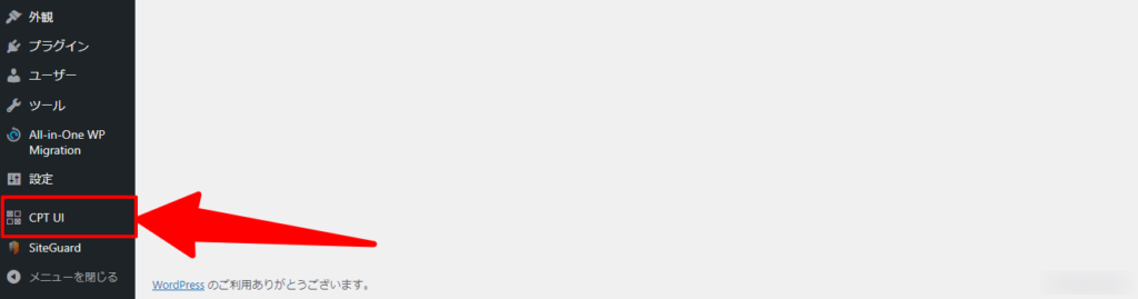 管理画面のサイドバーから「CPT UI」をクリックしてCustom Post Type UIの設定画面に移動します。
