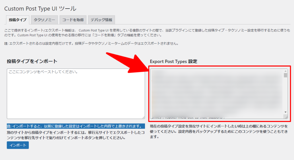 タブから「投稿タイプをインポート/エクスポート」をクリックします。