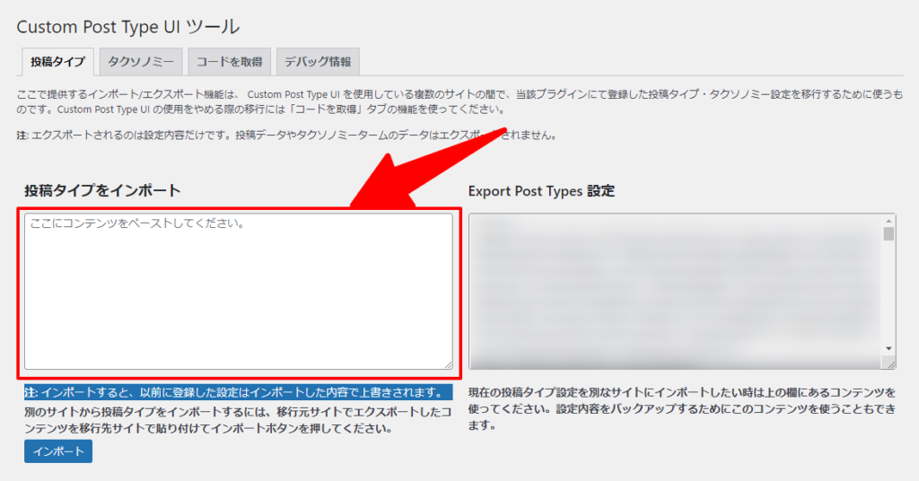 投稿タイプをインポート」に先ほどコピーしたコードを貼り付けます。