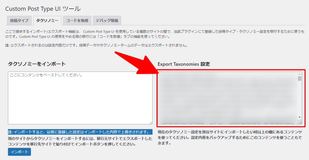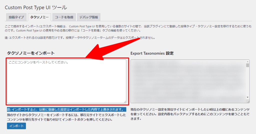 タクソノミーをインポート」に先ほどコピーしたコードを貼り付けます。