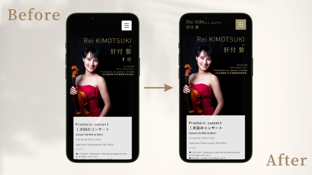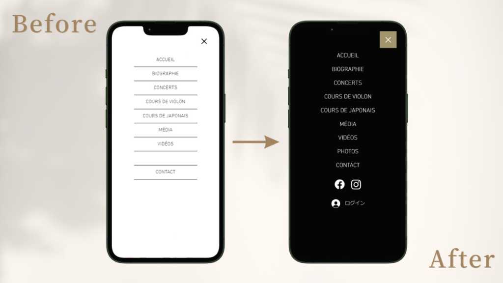 モバイル版のメニューが背景が白でしたが、ホームページが黒ベースだったので、こちらも黒に修正することでさらに洗練されたイメージになると思い、メニューの背景を黒にし、文字色を白にしました。
